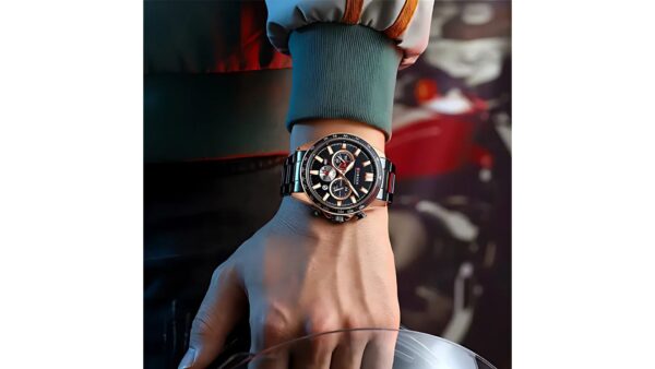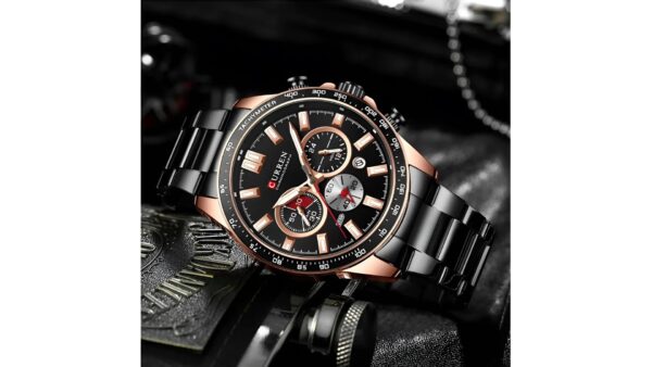 Integra caja oro rosa con bisel negro de 40 mm × 10 mm; correa Pavonada de acero inoxidable de 20 mm; movimiento de cuarzo japonés; resistencia al agua 3 ATM; cronógrafo; calendario; diseño analógico elegante.
