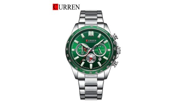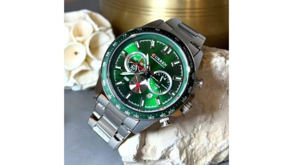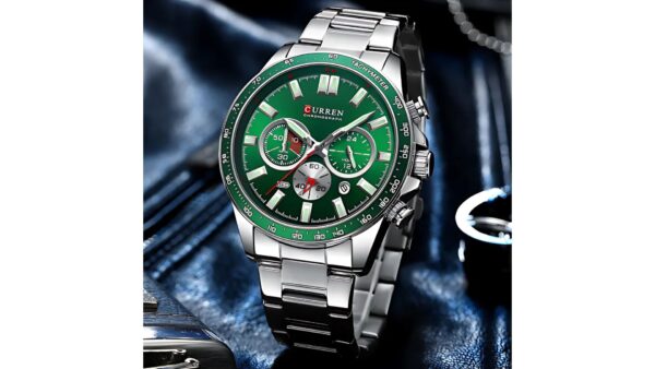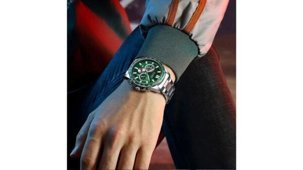 Integra caja plateada con bisel verde de 48 mm × 13 mm; correa plateada de acero inoxidable de 24 mm; movimiento de cuarzo japonés; resistencia al agua 3 ATM; cronógrafo; calendario; diseño analógico elegante.