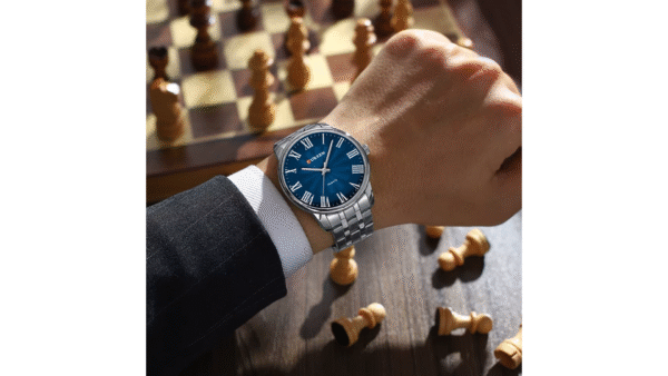 Integra movimiento de cuarzo japonés, caja de aleación de 44 mm diámetro y 11 mm grosor; brazalete de acero inoxidable de 22 mm; resistente al agua 3 ATM; ventana de calendario; diseño moderno-business casual