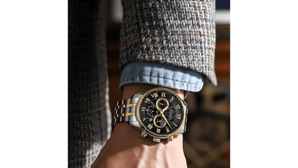 Integra cronógrafos totalmente funcionales, calendario y movimiento cuarzo preciso, con manecillas luminosas para mejor lectura; su diseño analógico combina elegancia y funcionalidad, acompañado de resistencia básica al agua para uso diario