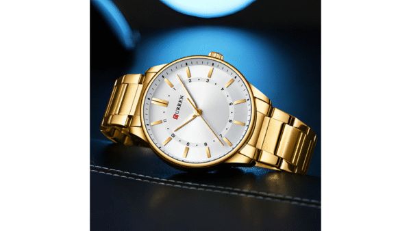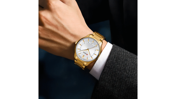 Integra caja de aleación dorada de 44 mm × 12 mm; correa dorada de acero inoxidable de 22 mm; movimiento de cuarzo japonés; resistencia al agua 3 ATM (lavado de manos); calendario; diseño analógico elegante