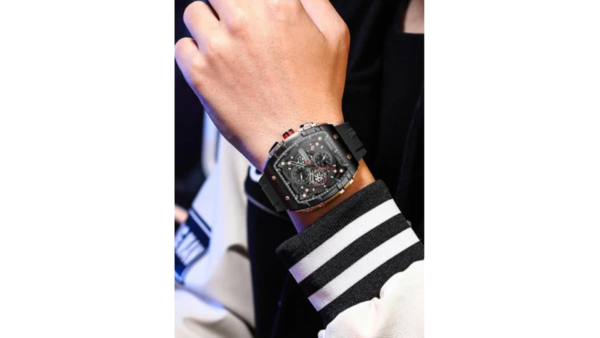 Integra análogo de cuarzo con cronógrafos funcionales, calendario automático y visualización de horas, minutos y segundos; caja de acero inoxidable, correa de silicona y vidrio Hardlex