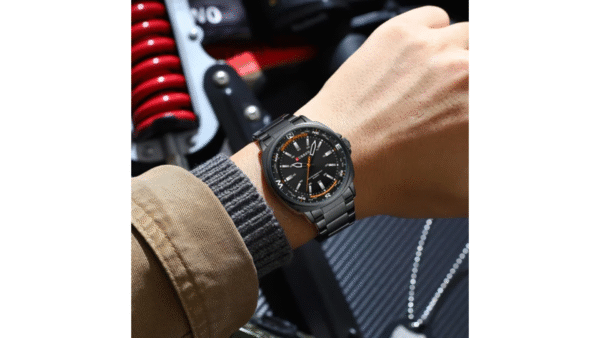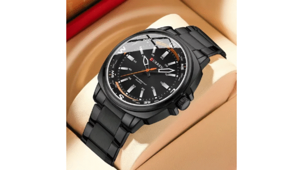 Integra movimiento de cuarzo, dimensiones: 41mm x 11mm, esfera diseño tipo brujula, color tablero negro, color de la caja negro, material lente vidrio mineral, caja en aleación, color del pulso negro, analógica manecillas (hora, segundos y minutos)