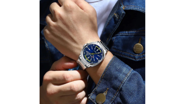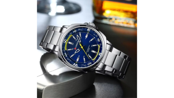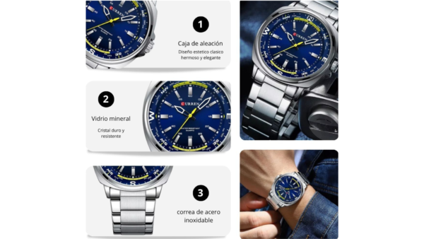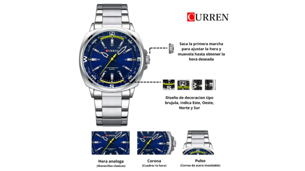 Integra movimiento de cuarzo, dimensiones: 41mm x 11mm, esfera diseño tipo brujula, color tablero azul, color de la caja plateado, material lente vidrio mineral, caja en aleación, color del pulso plateado, analógica manecillas (hora, segundos y minutos)