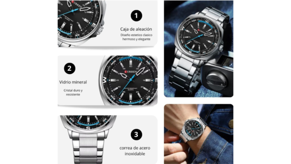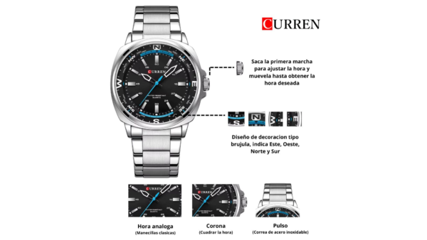 Integra movimiento de cuarzo, dimensiones: 41mm x 11mm, color tablero negro, color de la caja plateado, material lente vidrio mineral, material de la caja aleación, material del pulso acero inoxidable analógica manecillas (hora, segundos y minutos)