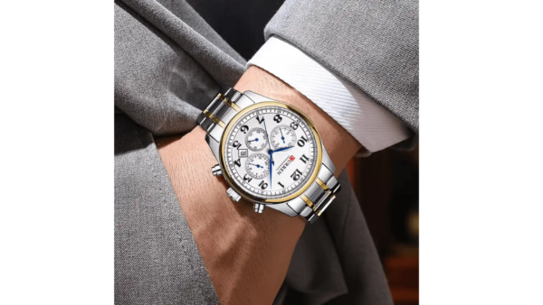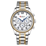 Reloj Curren de estilo clásico con números grandes, caja metálica resistente, pulso en acero inoxidable y movimiento de cuarzo. Incluye subesferas funcionales y calendario, cierre seguro y resistencia básica a salpicaduras, ideal para uso diario.