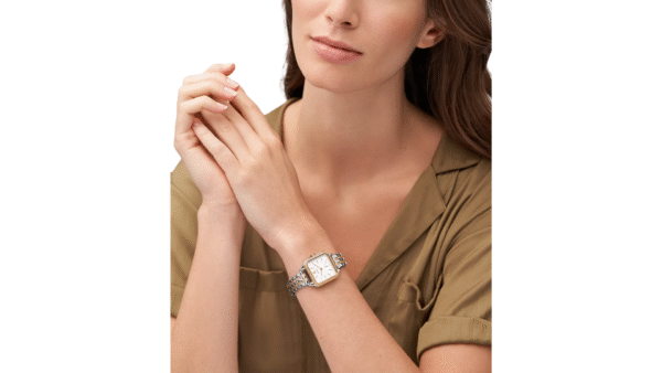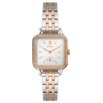 Integra movimiento de cuarzo de tres agujas, caja de 28 mm, correa de acero inoxidable tipo dos tonos, cristal mineral y resistencia al agua hasta 3 ATM