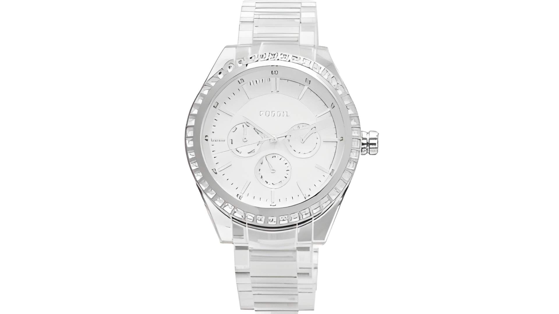 Integra movimiento de cuarzo multifunción con indicadores de día, fecha y formato 24 h; caja de acero inoxidable de 38 mm; brazalete de acero; resistencia al agua hasta 10 ATM