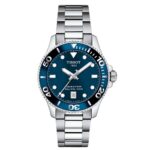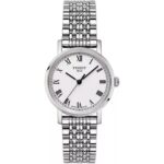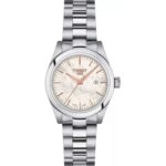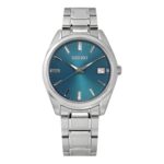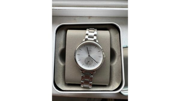 Integra caja plateada de 36 mm × 9 mm con bisel plateado; correa metálica plateada de 14 mm; movimiento de cuarzo; resistencia al agua 3 ATM; diseño analógico limpio y elegante con visualización de fecha.