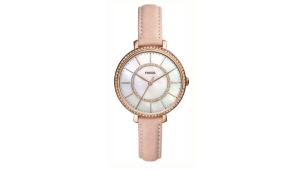 Integra caja de acero Dorada de 36 mm × 8 mm con bisel Plateado; correa de cuero rosa de 12 mm; movimiento de cuarzo; resistencia al agua 3 ATM; diseño analógico elegante con carátula madreperla.