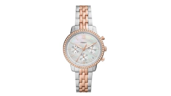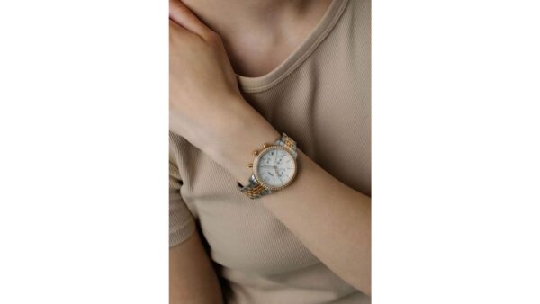 Integra caja de 36 mm × 11 mm con bisel blanco; correa metálica bicolor (plateada/oro rosa) de 14 mm; movimiento de cuarzo con cronógrafo y función de 24 h; resistencia al agua 5 ATM; diseño analógico elegante y funcional.