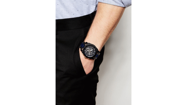 Integra cronógrafo con medición de segundos y minutos, función de fecha diaria y resistencia al agua hasta 50 m, con movimiento de cuarzo confiable, caja robusta de 45 mm y correa metálica duradera