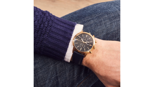 Integra cronógrafo de cuarzo con caja de acero inoxidable de 44 mm y correa de cuero. Cuenta con tres subesferas, resistencia al agua hasta 50 m y cristal mineral, combina elegancia y funcionalidad