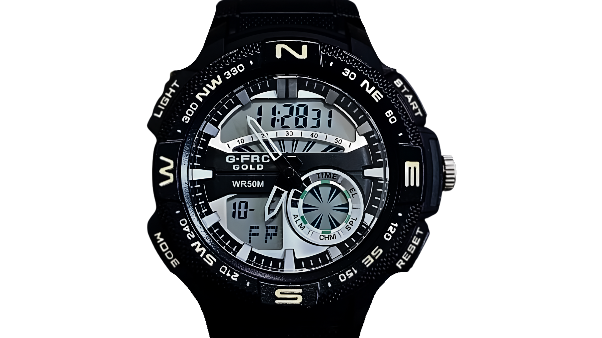 Integra función dual analógica/digital, calendario completo (día, fecha y hora), cronómetro de 1/100 s, alarma con snooze, luz de fondo LED para visibilidad nocturna y resistencia a salpicaduras