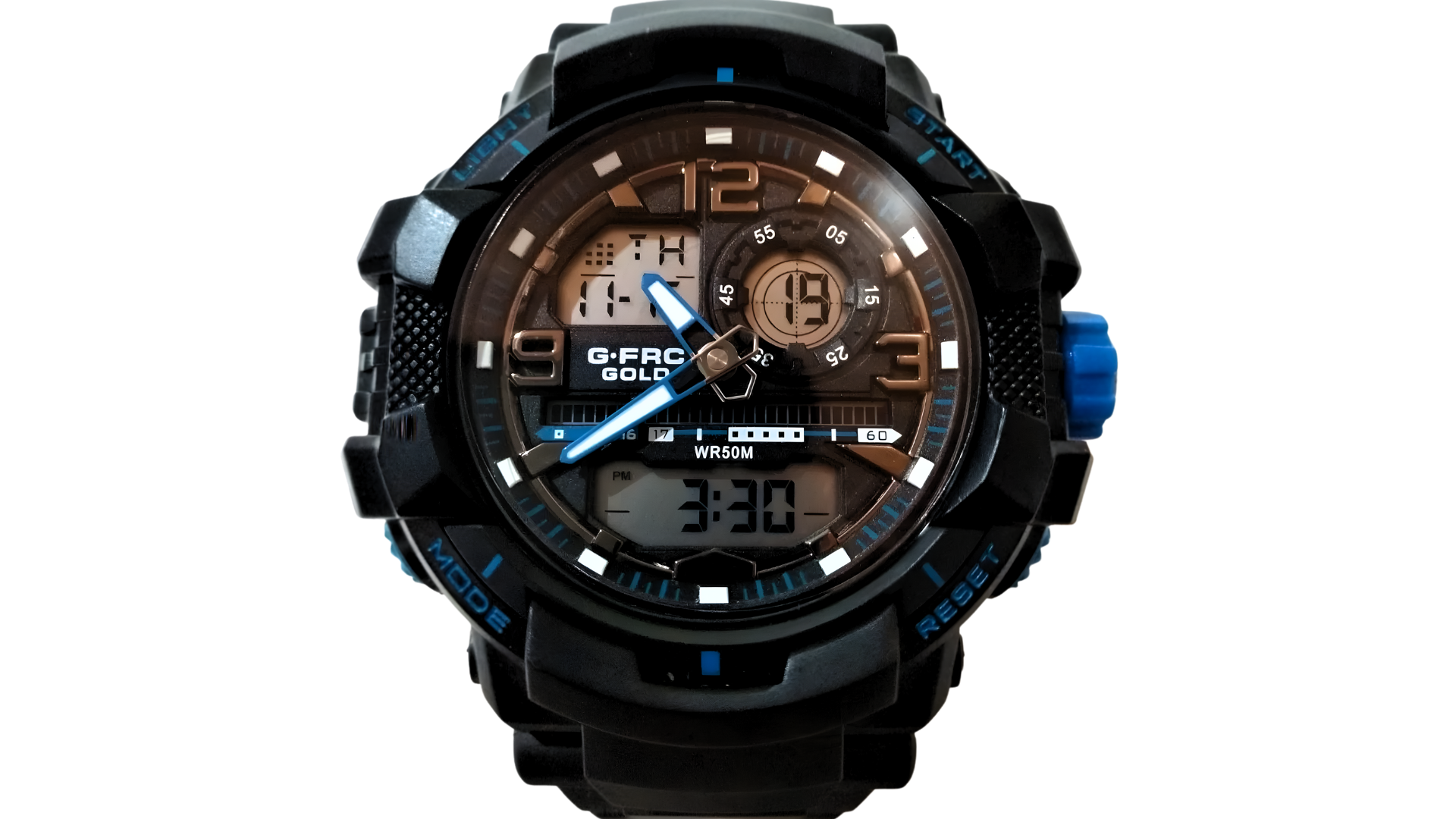 Integra funciones de doble hora digital/análogo, cronómetro, alarma, calendario y es resistente al agua hasta 50m, combinando estilo deportivo y funcionalidad diaria