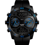 Integra analógico-digital con movimiento de cuarzo, caja de aleación de zinc, correa de silicona o goma, resistencia al agua hasta 3 atm (24 h uso cotidiano), función hora dual (analógica + digital) y refuerzo de estilo deportivo
