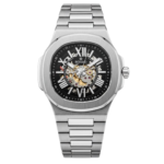 Integra mecanismo visible, caja resistente con diseño esqueleto, marcadores romanos de alta legibilidad, brazalete metálico robusto, movimiento preciso sin batería, tapa posterior transparente y construcción duradera ideal para uso diario
