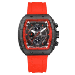 Integra cronógrafo con movimiento de cuarzo, caja metálica, función de cronómetro y calendario, correa ajustable de silicona/goma con cierre de hebilla, y resistencia básica al agua (3 ATM) para salpicaduras
