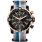 Integra cronógrafo con movimiento de cuarzo, cronómetro funcional, caja metálica de 45 mm, correa de nylon ajustable, cristal mineral, resistencia al agua 3 ATM e incluye estuche de marca