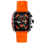 Integra cronógrafo de movimiento de cuarzo con función de calendario, cristal mineral, correa de goma, cierre tipo hebilla, y resistencia al agua para salpicaduras