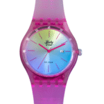 Integra esfera metálica con degradado arcoíris, agujas rosadas y marcadores finos. Incluye ventana de fecha, resistencia al agua de 10 BAR y diseño moderno con carcasa plástica mate