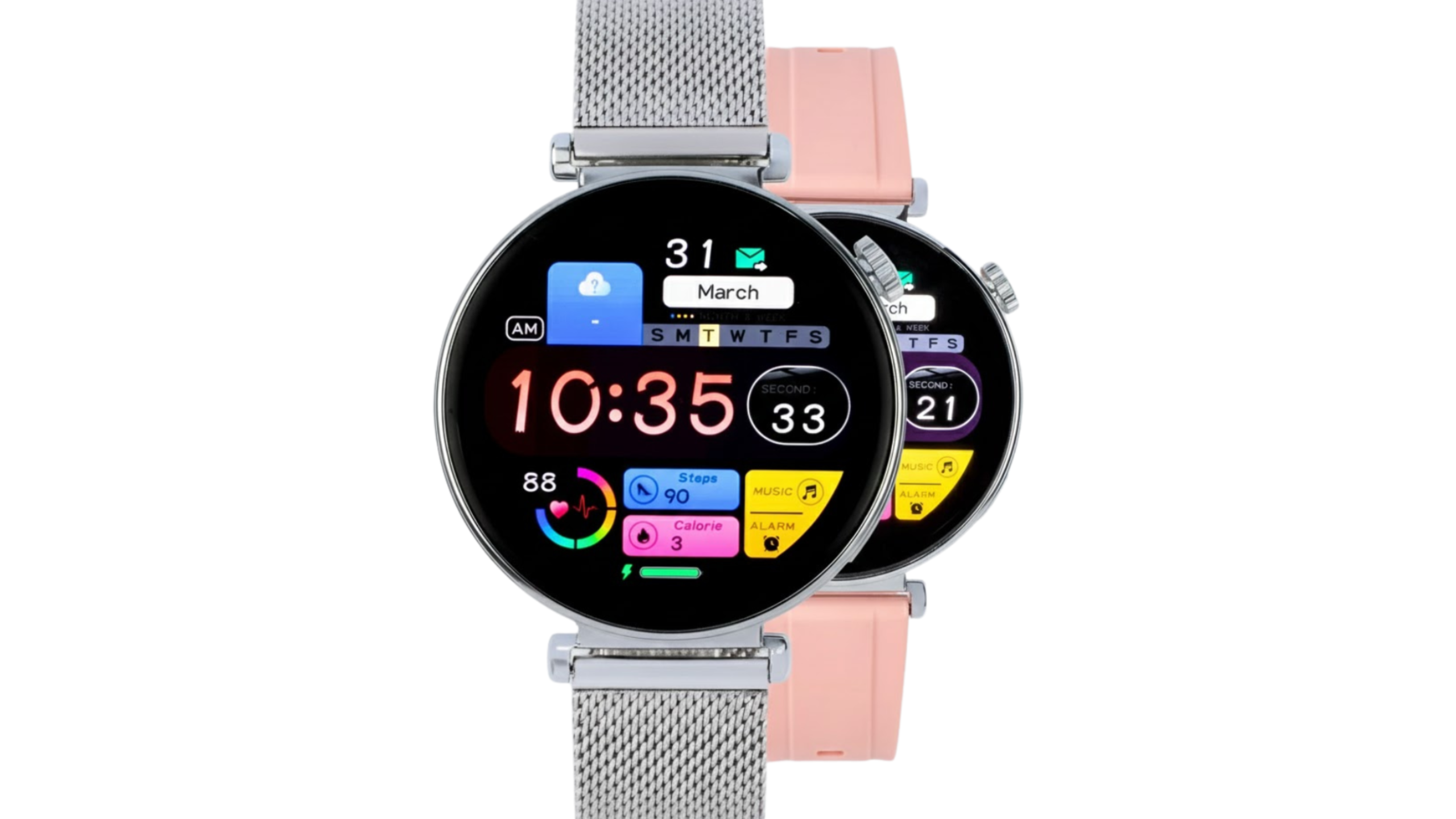 Integra reloj inteligente con conectividad Bluetooth, pantalla AMOLED táctil, múltiples modos deportivos, monitoreo de salud (ritmo cardíaco, presión, saturación, sueño), registro de pasos/calorías/distancia, incluye dos correas, metálica y plástica