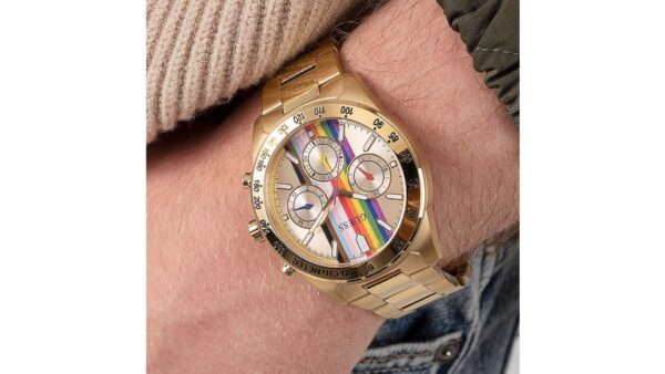 Integra movimiento de cuarzo multifunción con visualización de día, fecha y formato 12/24 horas, caja de acero de 42 mm, cristal mineral, brazalete de acero y resistencia al agua hasta 50 m.