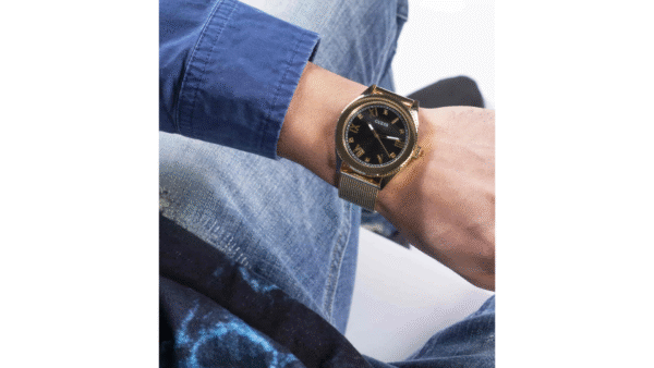 Integra movimiento de cuarzo analógico, caja de acero de 44 mm, correa tipo malla en acero inoxidable, cristal mineral y resistencia al agua hasta 50 m (5 ATM), con diseño elegante para uso diario