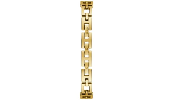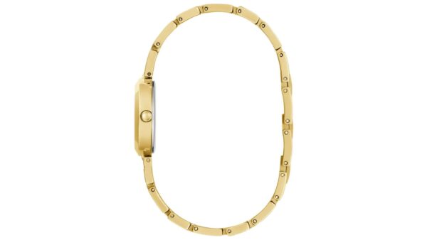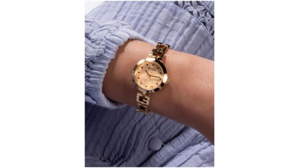 Integra caja dorada de 26 mm; correa metálica dorada de acero inoxidable de 10 mm; bisel dorado; carátula champán (“champagne”); movimiento de cuarzo; resistencia al agua 3 ATM (30 m); diseño analógico elegante femenino