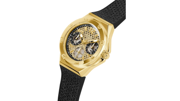 Integra movimiento de cuarzo fiable, funciones de fecha y día, caja de acero inoxidable de 40 mm protegida por cristal mineral, correa de silicona cómoda, índice multifunción y resistencia al agua hasta 5 ATM, color Negro/Dorado