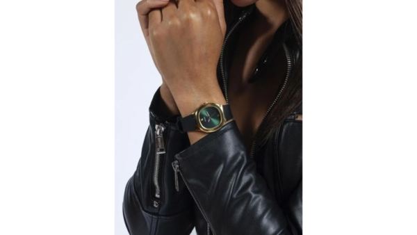 Integra movimiento de cuarzo, cristal mineral, caja de acero con recubrimiento PVD, correa de silicona, resistencia al agua de 30 m, marcador de diamante sintético a las 12h, forma cuadrada redondeada, diámetro ~32 mm