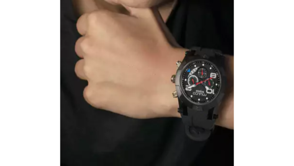 Integra movimiento de cuarzo multifunción, caja de 46 mm curvada, correa de silicona, ventana semicircular de fecha y es resistente al agua hasta 100 metros