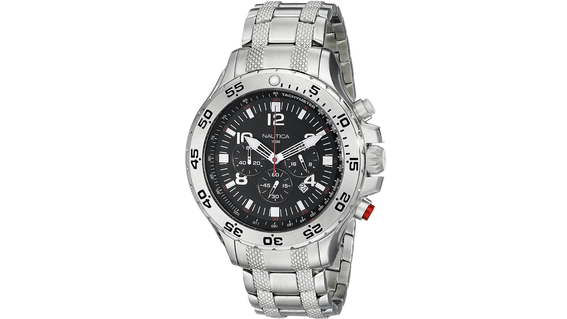 Integra cronógrafo, movimiento de cuarzo con caja de acero inoxidable de 47-53 mm, tres subesferas (60 s, 60 min, 24 h), ventana de fecha, bisel taquímetro, cristal mineral y resistencia al agua de hasta 100 metros
