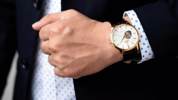 Integra caja de acero de 41 mm, ventana “open heart” que muestra parte del mecanismo, cristal mineral, resistencia al agua de hasta 5 ATM (~50 m) y correa de cuero