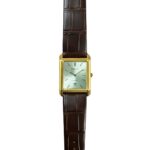 Integra caja rectangular dorada y correa de cuero marrón con textura tipo cocodrilo