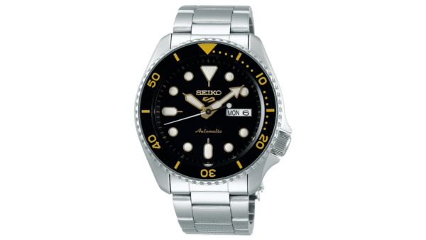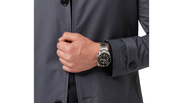 Integra visualización de día y fecha, corona sobreelevada tipo 4 h, bisel giratorio unidireccional, cristal Hardlex y resistencia al agua hasta 100 m