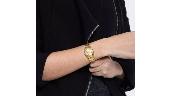Integra movimiento calibre 4207 de 21 joyas, indicación de día y fecha, cristal Hardlex, caja de acero de 25 mm de diámetro y hermeticidad hasta 30 m