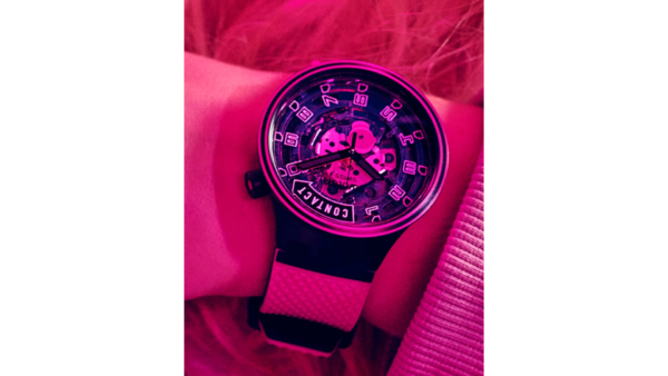 Integra movimiento de cuarzo suizo, caja redonda de 47 mm en plástico con acabado “Solar Spectrum”, correa de silicona, esfera transparente de tipo skeleton con manecillas e índices luminiscentes