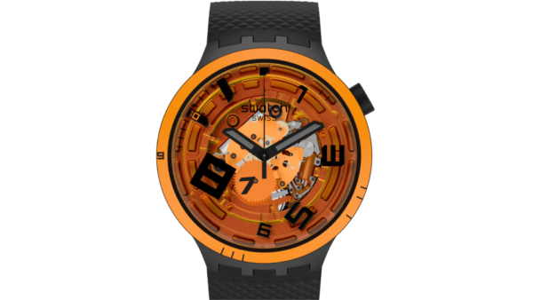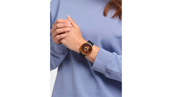 Integra movimiento de cuarzo suizo, caja redonda de plástico de 47 mm y correa de silicona bicomprimida. Tiene esfera transparente con detalles llamativos, agujas de hora, minuto y segundo