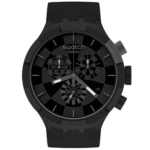 Integra cronógrafo analógico con movimiento suizo; funciones: medición de tiempo (tres subesferas), fecha, resistencia al agua de 30 m, caja de 47 mm y correa de silicona negra, colección “Checkpoint Black”