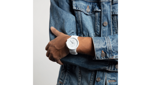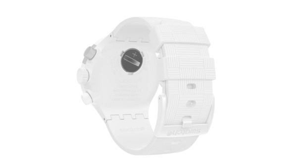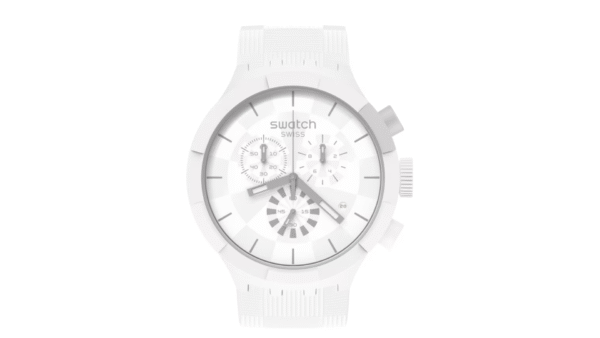 Integra cronógrafo con movimiento de cuarzo suizo; funciones clave: cronómetro triple, indicador de fecha (4 h), caja de 47 mm en plástico, correa de silicona, agua 30 m y diseño cuadriculado distintivo, colecciòn “Chequered White”