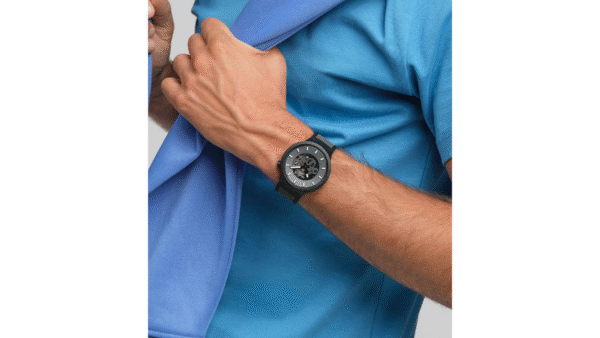 Integra caja de 47 mm en material biosourcing; funciones clave: hora analógica (3 manecillas), índices 3D luminiscentes, cristal bioplástico transparente, movimiento de cuarzo suizo y resistencia al agua de 30 m, colección Past The Horizon