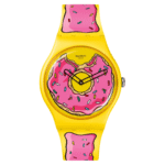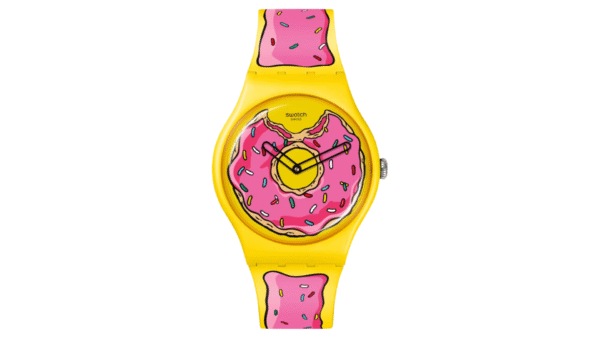 Integra movimiento de cuarzo suizo, caja y cristal fabricados con materiales de origen biológico, correa abotonada con estampado “glaseado”, esfera decorada con motivos de dona en colaboración con The Simpsons