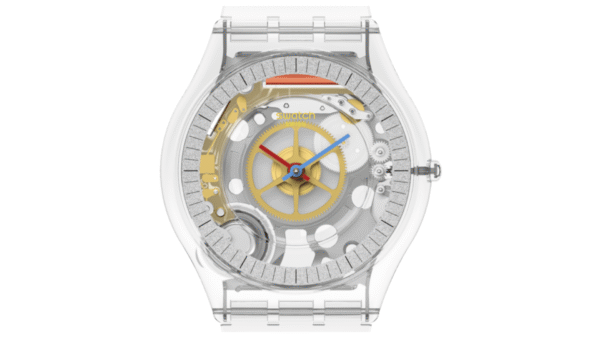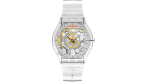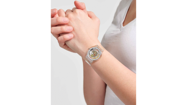 Integra movimiento de cuarzo suizo, visualización analógica de tres manecillas, caja ultradelgada de 34 mm y 3,9 mm de grosor, resistencia a salpicaduras (3 bar), correa de TPU y diseño de caja biológica transparente