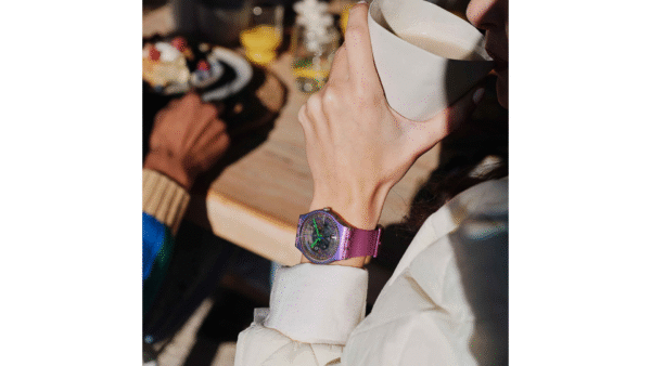 Integra caja de 41 mm y correa de silicona morada con efecto Anodamazing; funciones: hora analógica (3 manecillas), resistencia al agua 30 m y diseño brillante con estética solar Spectrum, colección “Shimmer Purple”