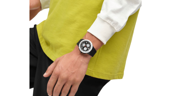 Integra cronógrafo con movimiento de cuarzo suizo, caja plástica con bisel fijo de escala taquimétrica, correa de silicona, función de fecha, y resistencia al agua hasta 30m