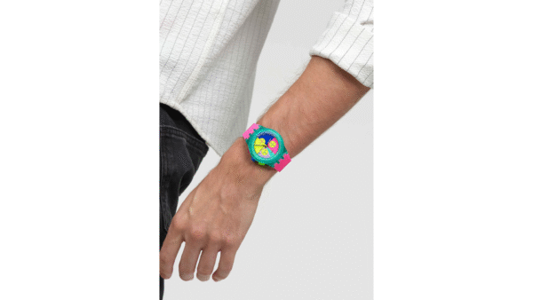 Integra cronógrafo, movimiento de cuarzo suizo, caja de resina de 42 mm, escala taquimétrica y ventana de día, correa de silicona, resistencia al agua de 3 atm; diseño audaz inspirado en los años 90