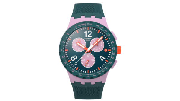 Integra cronógrafo de cuarzo preciso, ventana de fecha, taquímetro integrado, movimiento suizo fiable, resistencia al agua para salpicaduras (3 ATM), caja robusta de resina con cristal acrílico y correa cómoda de silicona
