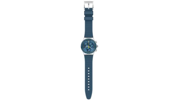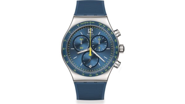 Integra movimiento de cuarzo preciso, cronógrafo, función de fecha (ventana “date”), caja de acero inoxidable pulido, correa de caucho azul texturizada, esfera azul cepillada y resistencia al agua hasta 30 metros.