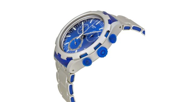 Integra movimiento de cuarzo fiable, cronógrafo con función de fecha, caja de aluminio en tono plateado, correa tipo malla metálica plateada, esfera azul, resistencia al agua hasta 30 metros (3 bar) y diseño elegante-urbano con acabado ligero.